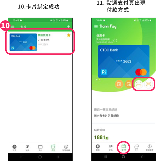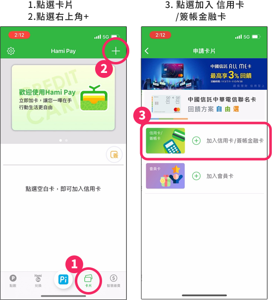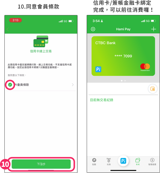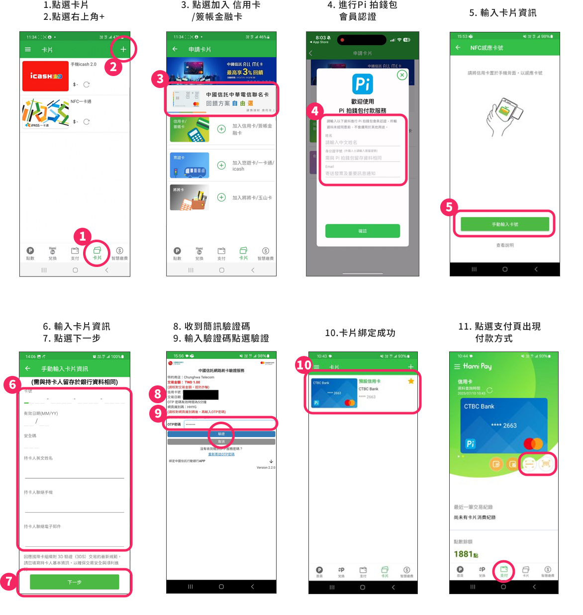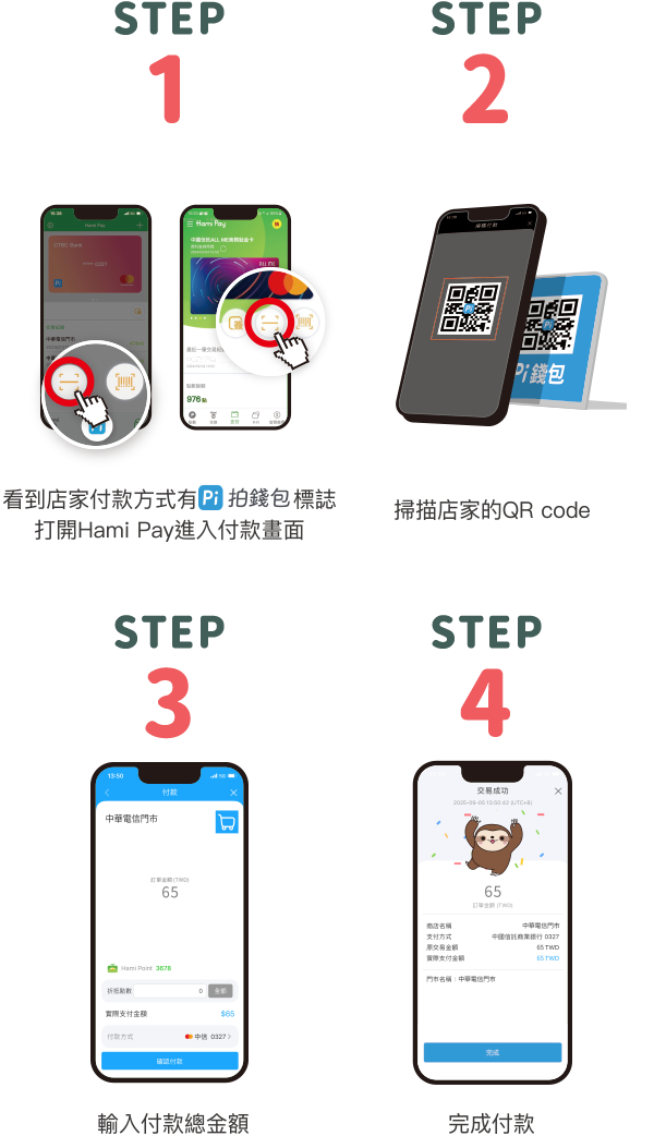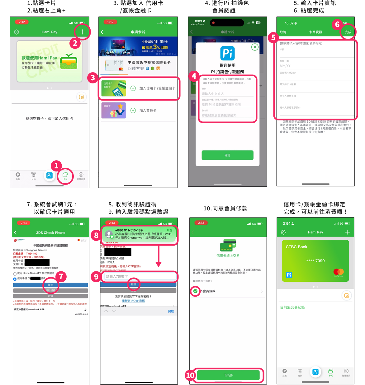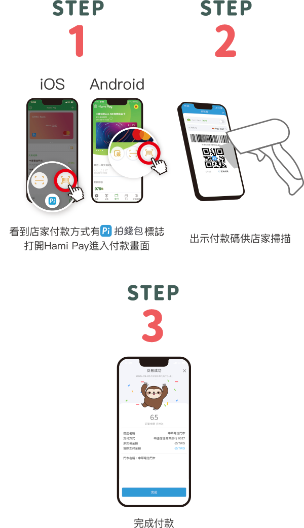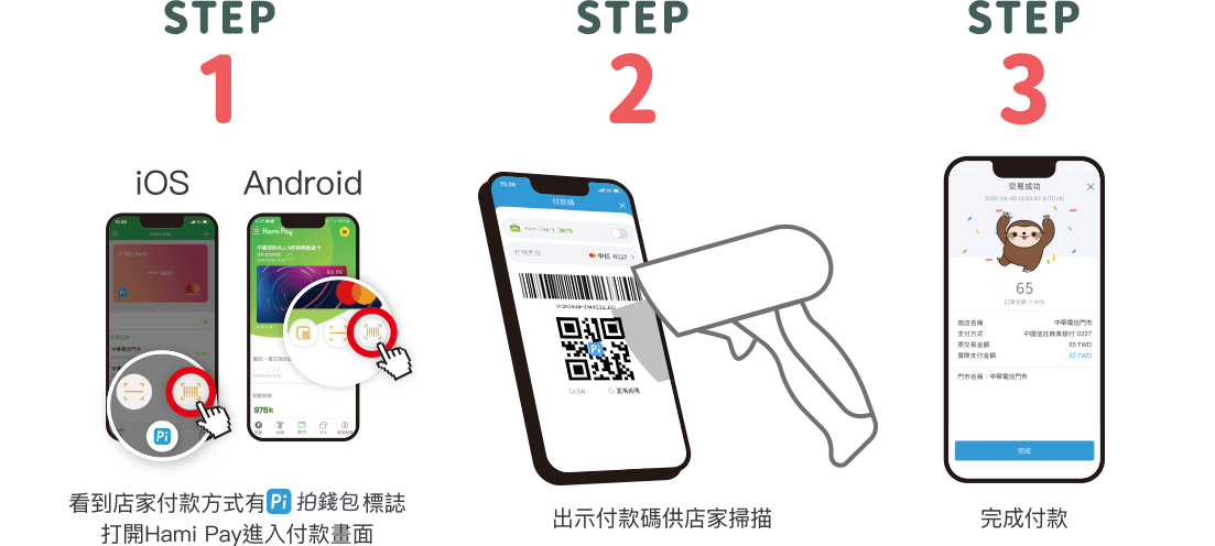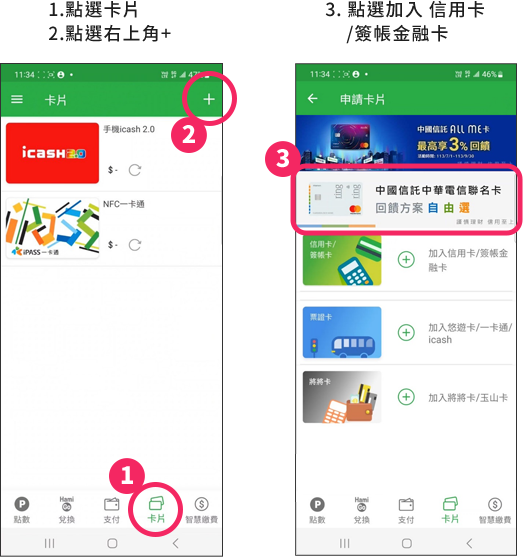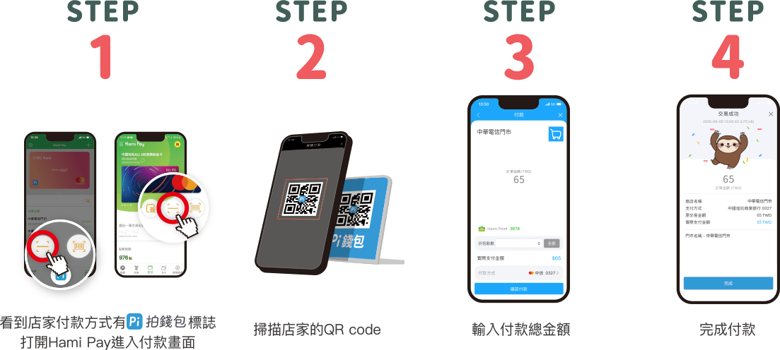 - 本活動限於 Hami Pay App內綁定指定銀行信用卡並掃碼支付成功,銀行信用卡包含中國信託(「最高3%」僅限使用中國信託中華電信聯名卡且選擇以Hami Point回饋)、國泰世華、台新、玉山之VISA、MasterCard卡,或將來銀行之VISA debit卡。如非以「開啟」Hami Pay App →出示/掃描付款碼的方式完成付款,則不符合本活動回饋資格。