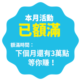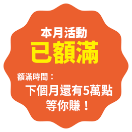 - 每月限量贈點5萬點,贈完為止(按交易時間排序結算贈點)並於本活動頁公告,惟公告時間非等同活動實際額滿時間,實際額滿時間以系統資料為準,額滿時間詳見活動頁公告,如額滿時適逢例假日,將順延下一個工作天公告。