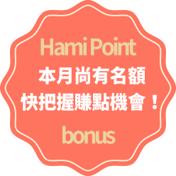 - 本活動贈點皆不得轉換、轉讓、折換現金或其他形式調整,逾期視同作廢,恕不補發。若有下列情形恕不符合活動贈獎資格:移除Hami Pay APP、Hami Pay門號失效、中華電信會員異動等因素導致匯入失敗、惡意虛偽交易、帳務爭議或其他違反誠信原則等情事。