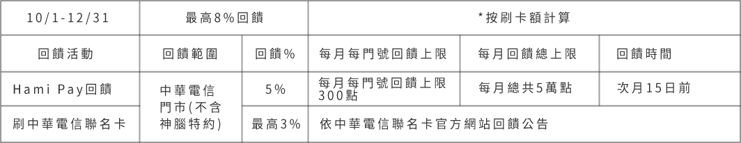 【中華電信門市回饋】使用Hami Pay綁定信用卡掃碼支付,於中華電信實體門市(不含神腦特約)消費,可享刷卡金額最高8%點數回饋。