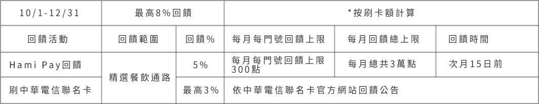 【精選餐飲回饋】使用Hami Pay綁定信用卡掃碼支付,於指定餐飲商家消費,可享刷卡金額最高8%點數回饋。