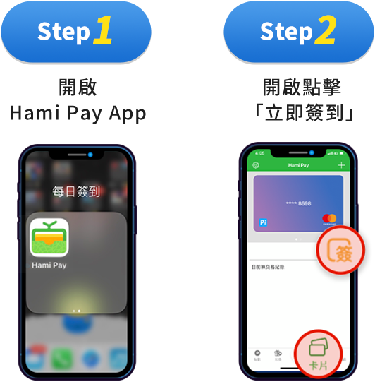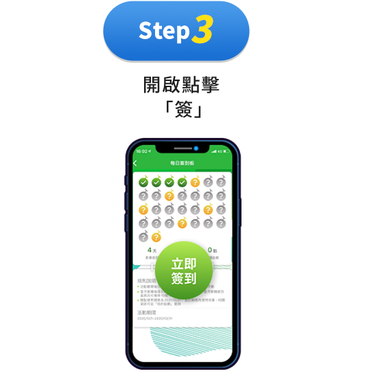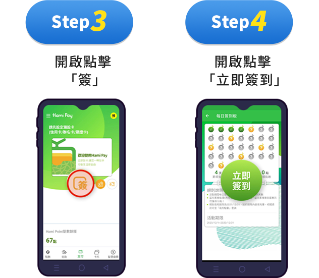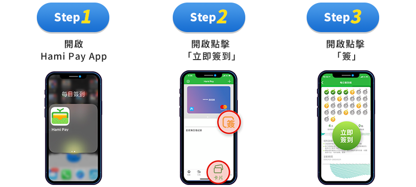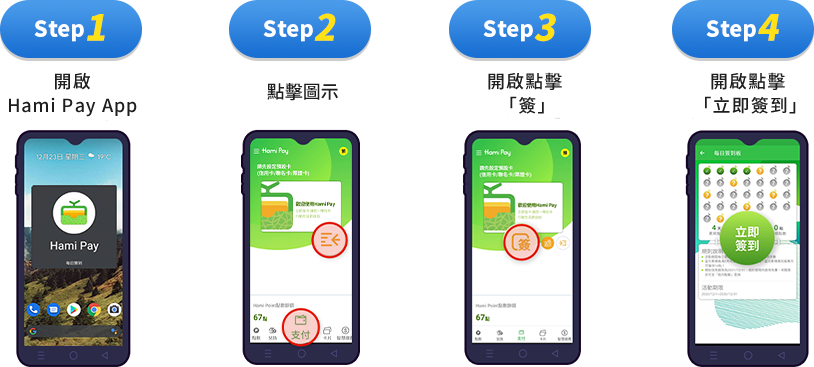 - 客戶需開啟Hami Pay APP→點選「簽」→「立即簽到」,才算完成當日簽到。完成累積天數贈點將於簽到完成後入點。贈點使用期限為2026/01/31,逾期失效恕不補發。