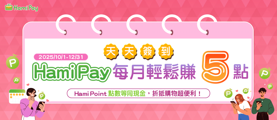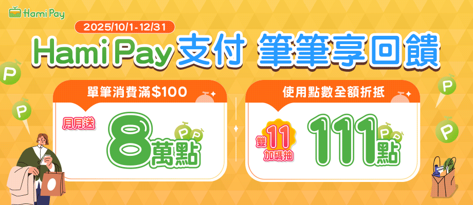 ★2025/10/1-12/31活動期間,用Hami Pay掃碼支付滿額享隨機回饋!雙11期間加碼抽111點!