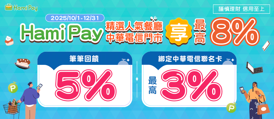 ★2025/10/1-12/31活動期間,中華電信實體門市及精選人氣餐廳用Hami Pay掃碼支付加碼享最高8%回饋!